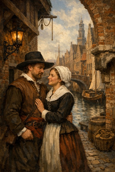 Rolf became an orphan at an early age and went to sea. At the age of eighteen he appears in the alley St. Tunis in Amsterdam, where the widow Tryn and her two daughters have also moved. Love arises between Rolf and Annika and they get married on a spring day in 1623 in the New Reformed Church. Tryn is a witness when Rolf signs the marriage certificate with an R and Annika with a +. From now on we will call her Anneke, because it is under that name (and also Annetje) that she is known.