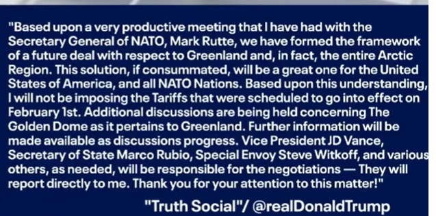 “ Together with Rutte, [we] have developed a framework for a future settlement concerning Greenland and, by extension, the entire Arctic region. This solution, if pursued, will be very beneficial to the United States of America and all NATO members,” Trump exclaimed on Truth Social after meeting with Rutte in Davos. “ All the United States is asking for is a place called Greenland, ” he was heard saying in the Davos speech .